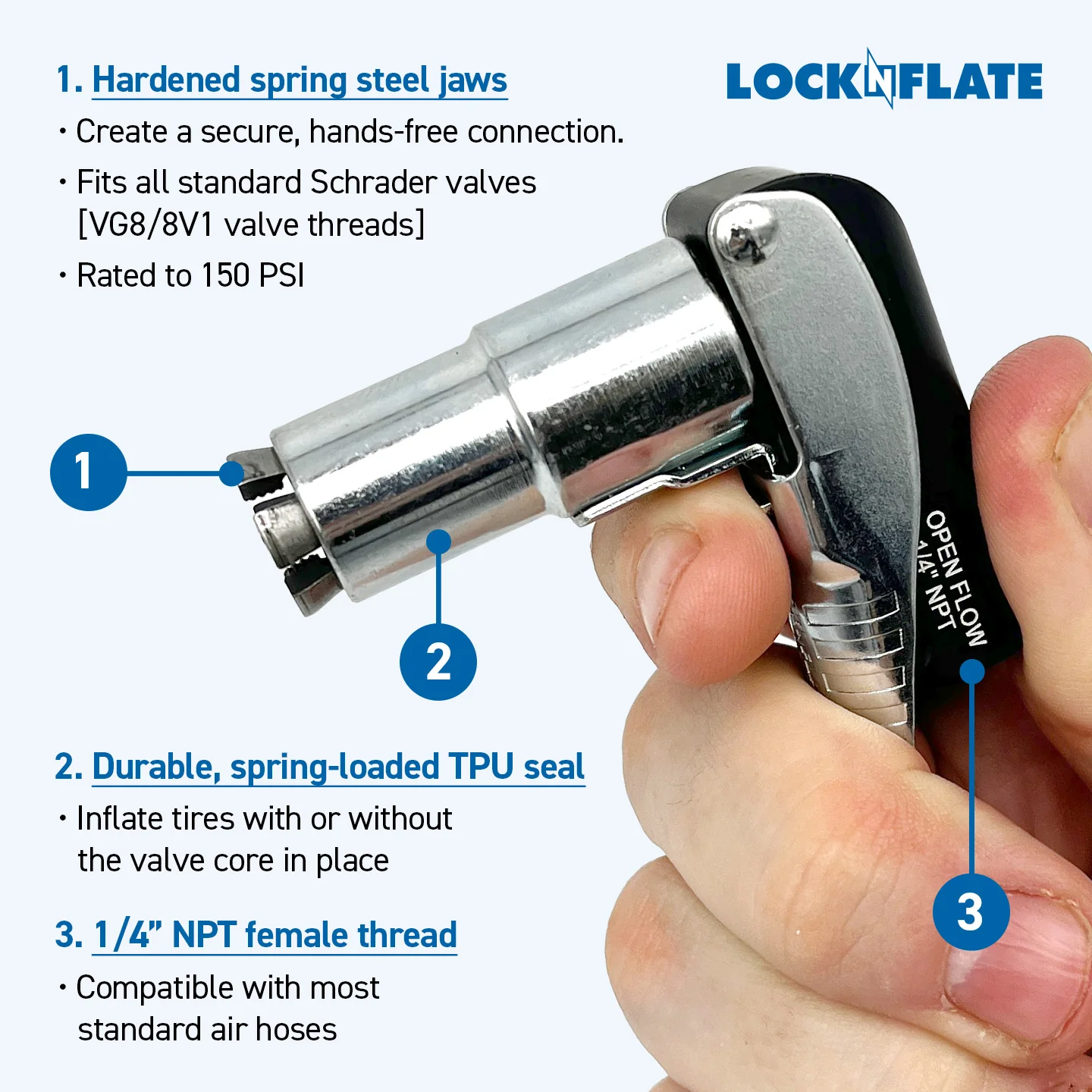 • REVOLUTIONARY DESIGN: six steel jaws lock onto any Schrader valve to create a secure, hands-free connection.